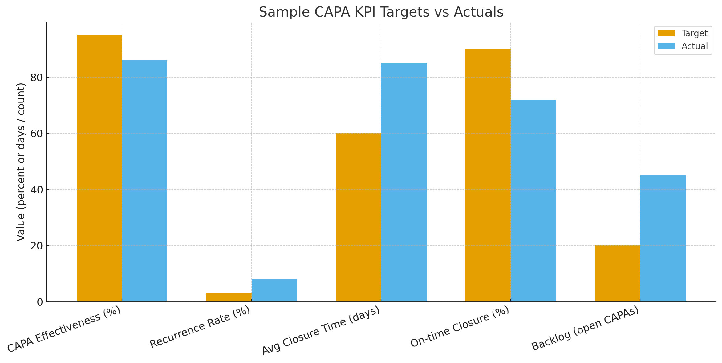 Here is a sample chart that contrasts typical CAPA targets and actuals (CAPA effectiveness, recurrence, average closure time, on-time closure, and backlog).