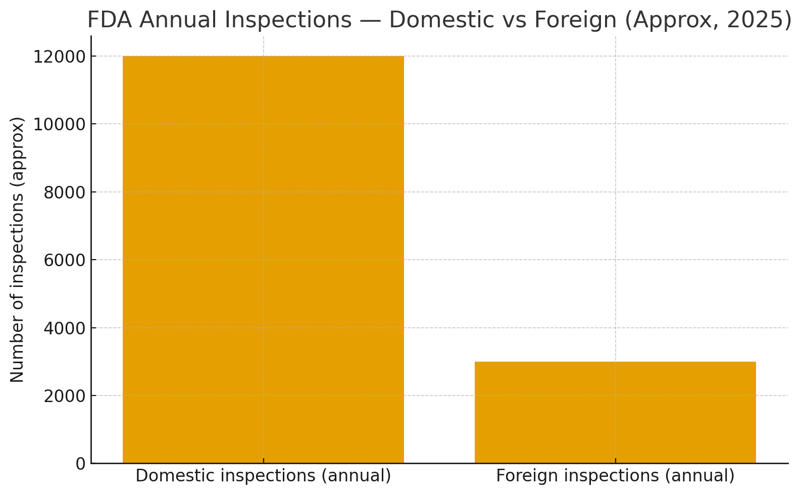 - The FDA has indicated it conducts roughly 12,000 domestic inspections and about 3,000 foreign inspections annually. The agency has also expanded the use of unannounced inspections at foreign manufacturing sites. This expansion increases the chance that any given foreign facility may receive an unannounced visit.